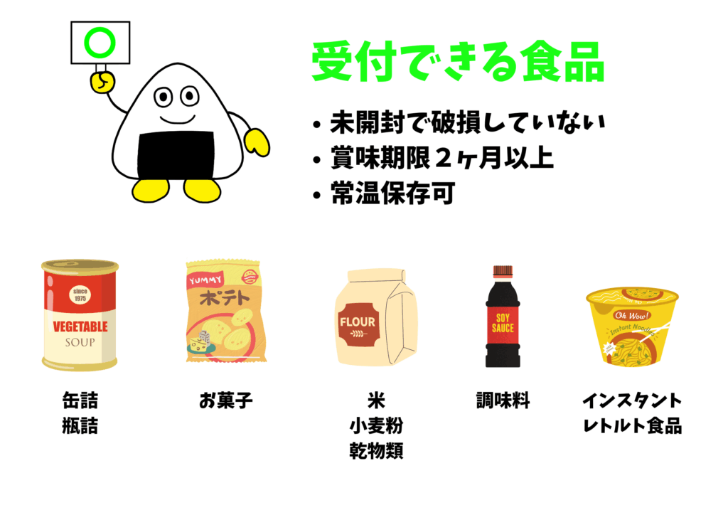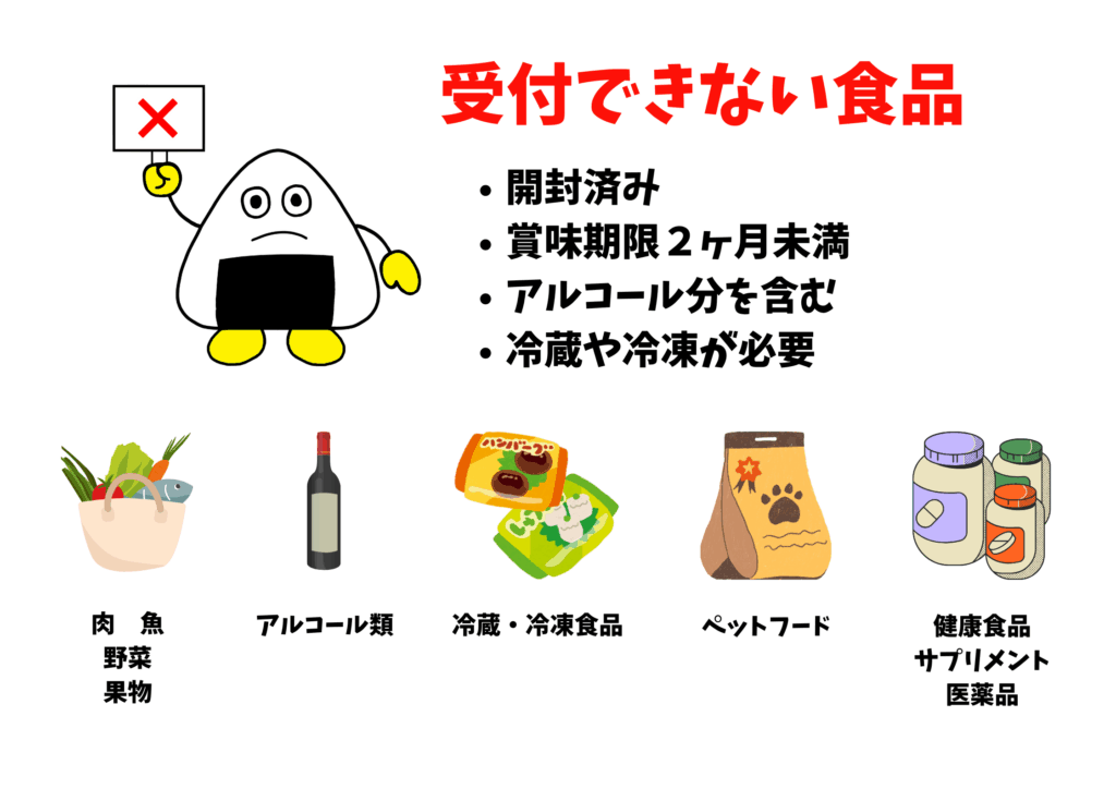 回収できる食品にはルールがございます。お持ち込みの際には、必ず以下の「受付できる食品」「受付でいない食品」をご確認ください。