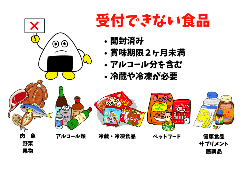 回収できる食品にはルールがございます。お持ち込みの際には、必ず以下の「受付できる食品」「受付できない食品」をご確認ください。